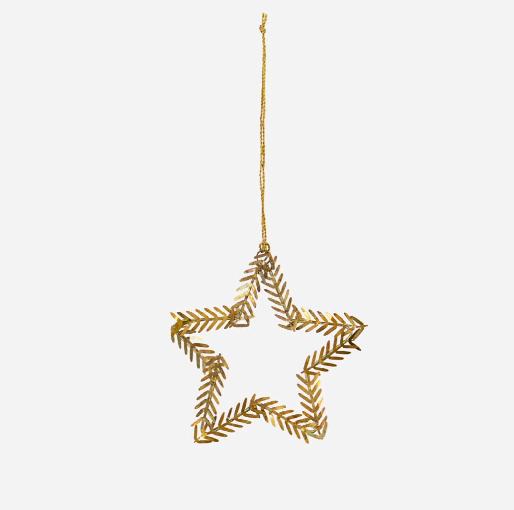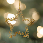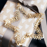 Gold cut metal shaped leaves outline a star shape. Perfect as a present topper or on your tree to add a bit of shine.