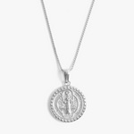 A reversible round charm featuring St. Benedict on one side and a cross on the other. Representing protection and prayer, especially during challenging times, the iconography embedded into this piece represents opening doors, diverting difficult paths, and protecting good health.
