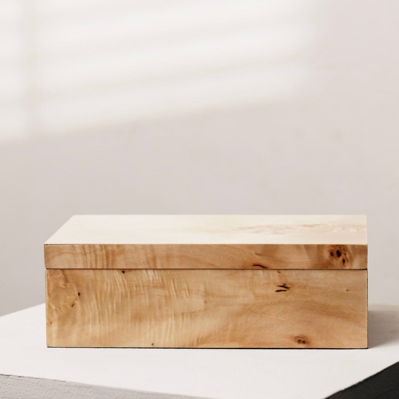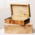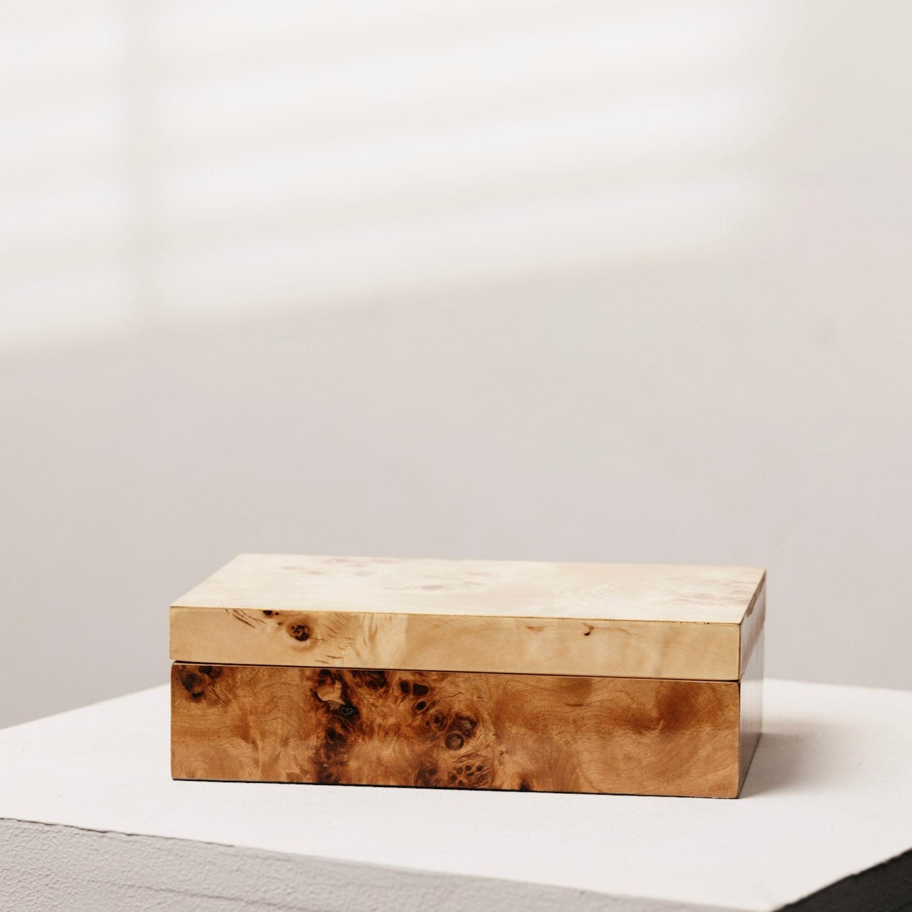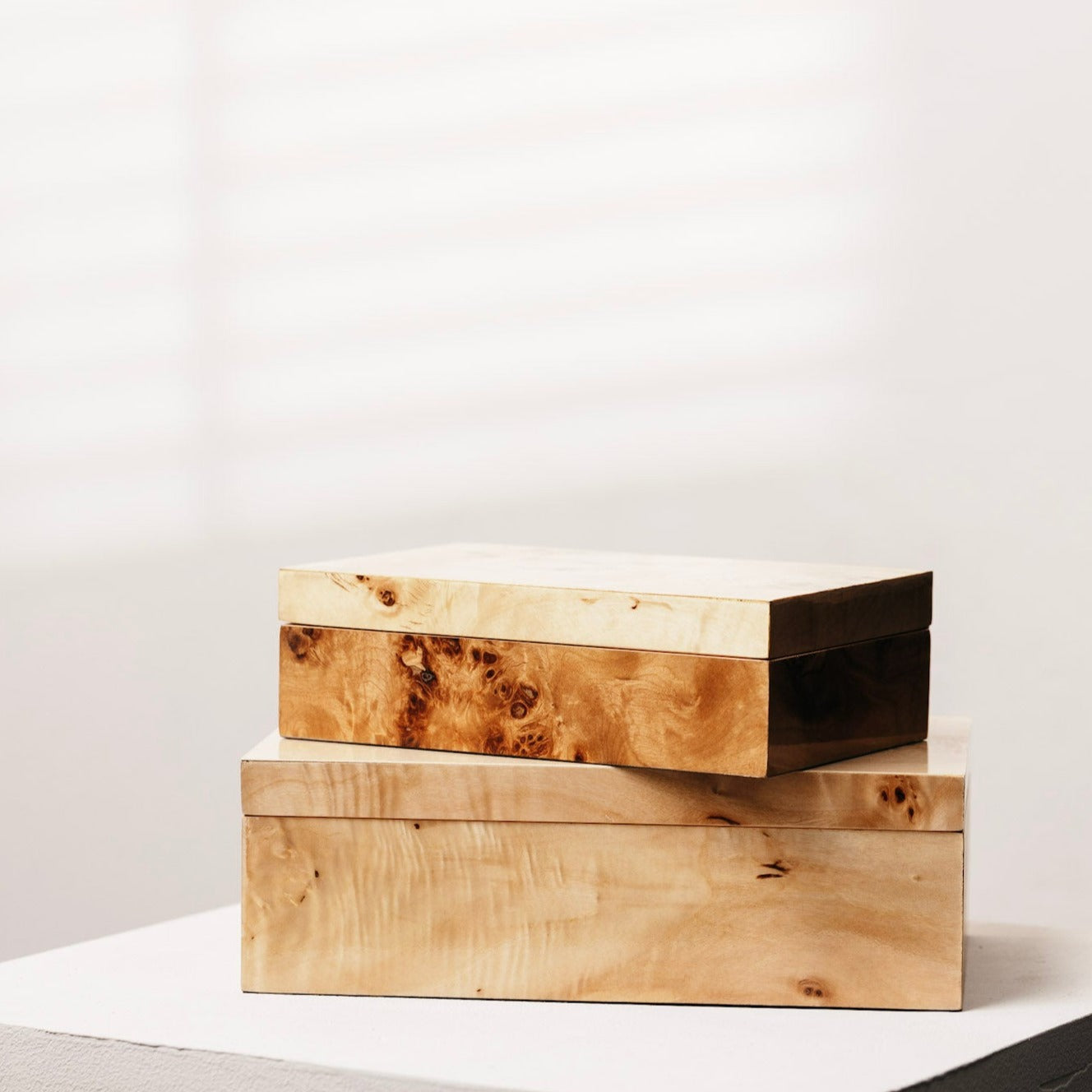 Even when imperfect, nature's beauty is inspiring. Burl wood, created through an irregularity that forms in a growing tree's trunk is a much sought after wood grain. These Burl Wood boxes boast a classic silhouette with an even more everlasting style. The rich black velvet bottom, protects your precious pieces within & shows the quality in crafting this gorgeous piece. Sold in two sizes to fit your storage & decor needs.