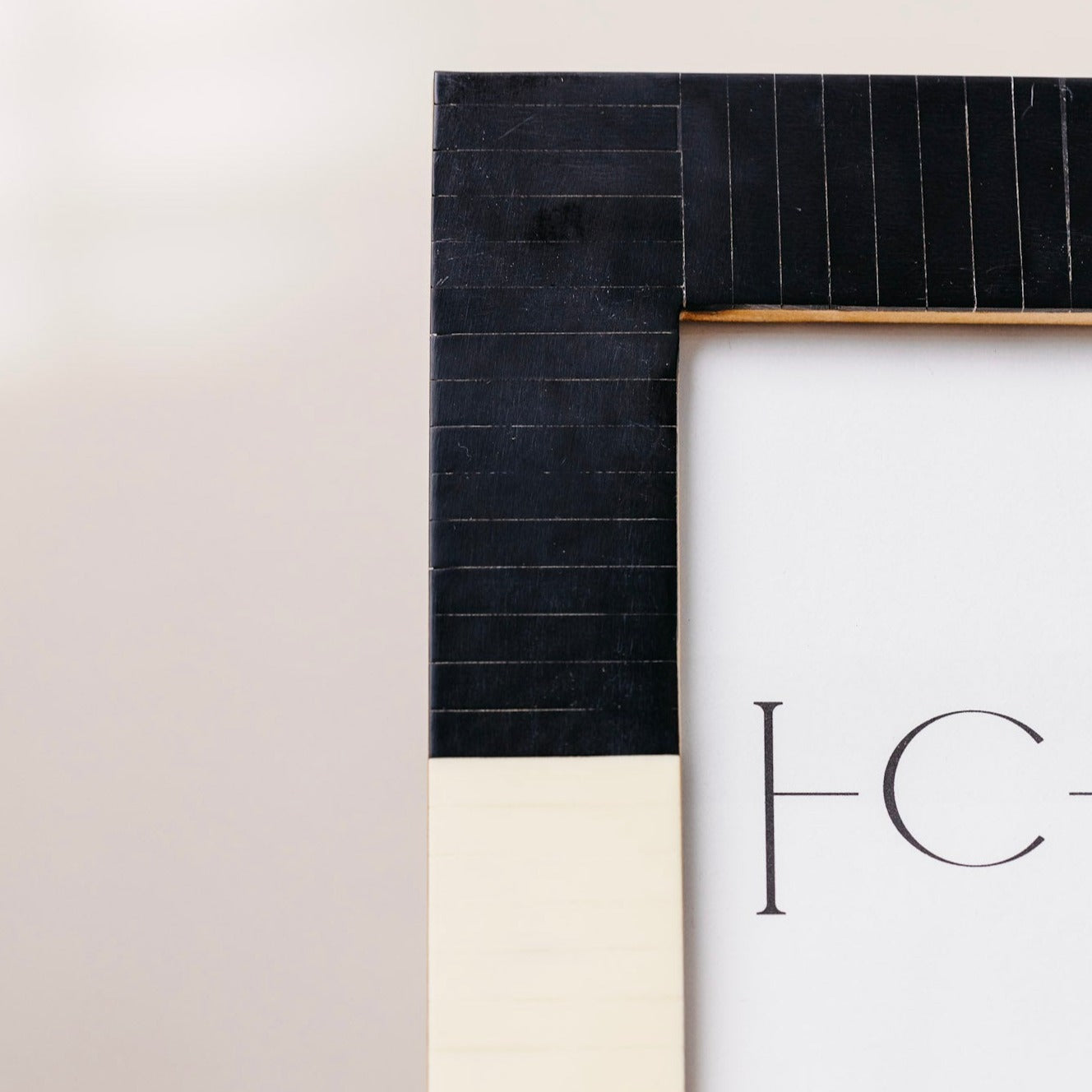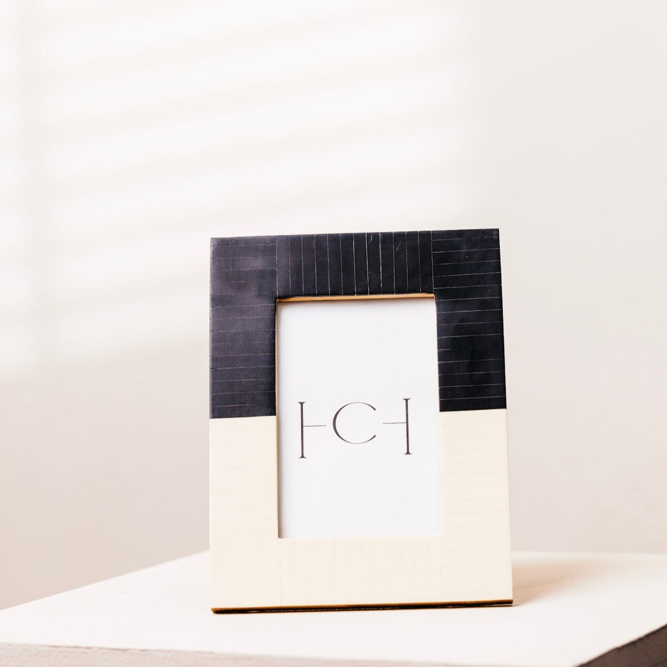 High contrast & timeless style, the Gemini Photo Frame brings a beautiful balanced style to your space. Crafted from a bleached & ebony died bone veneer, this frame is the perfect choice for highlighting your most cherished memories.