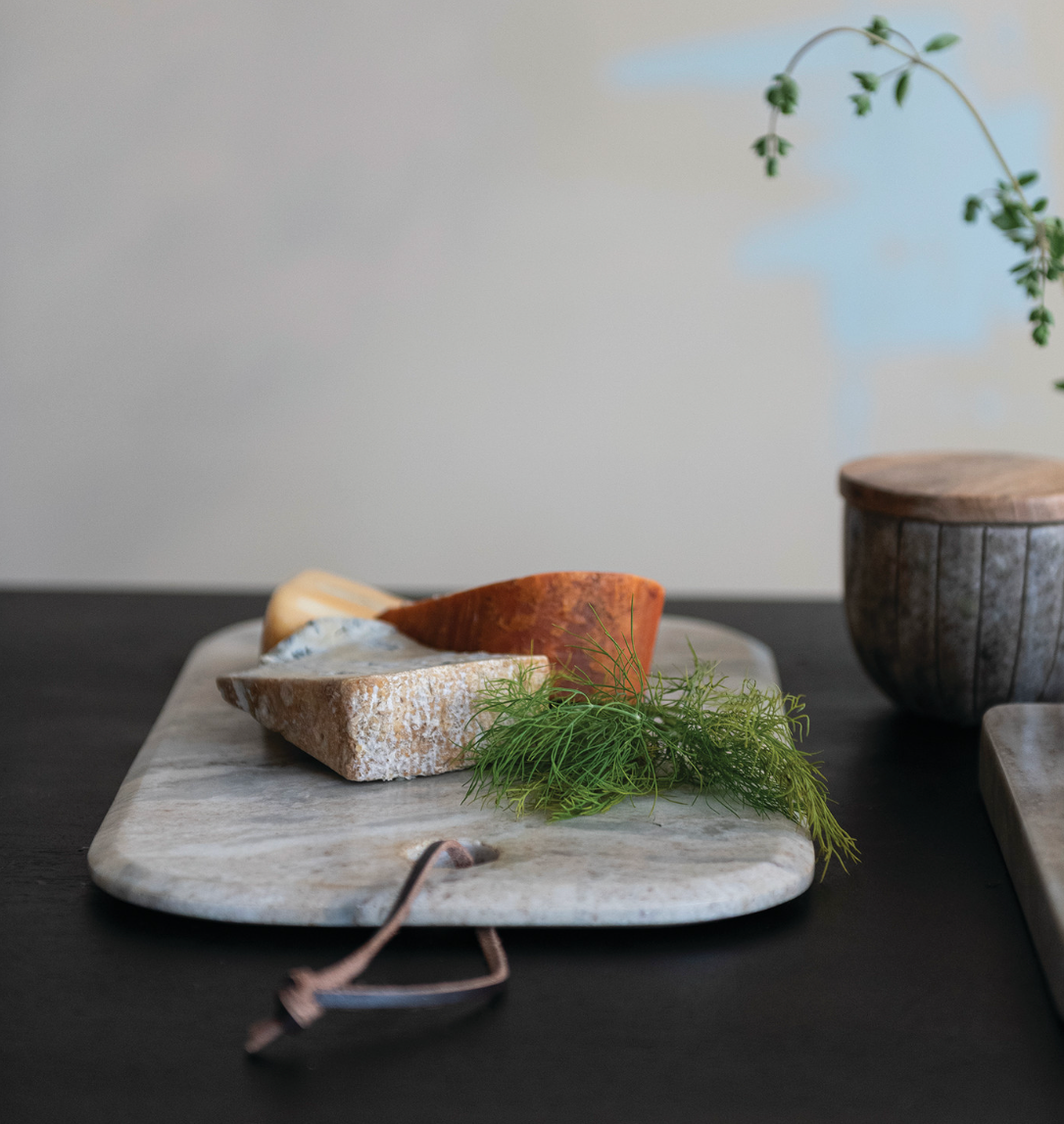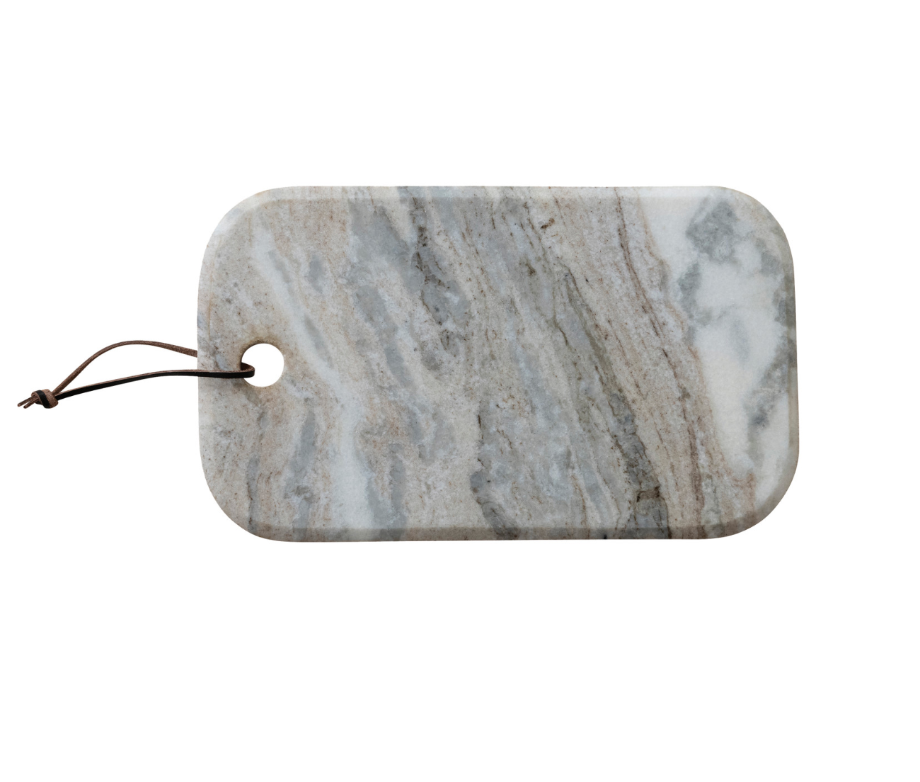 Effortless hosting starts here. Crafted from marble with a warm tone + natural variation in every piece. The simple leather tie adds a subtle, thoughtful detail, perfect for hanging when not in use. Layer it with cheeses, bread, or seasonal bites and let the board do half the styling for you.