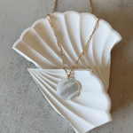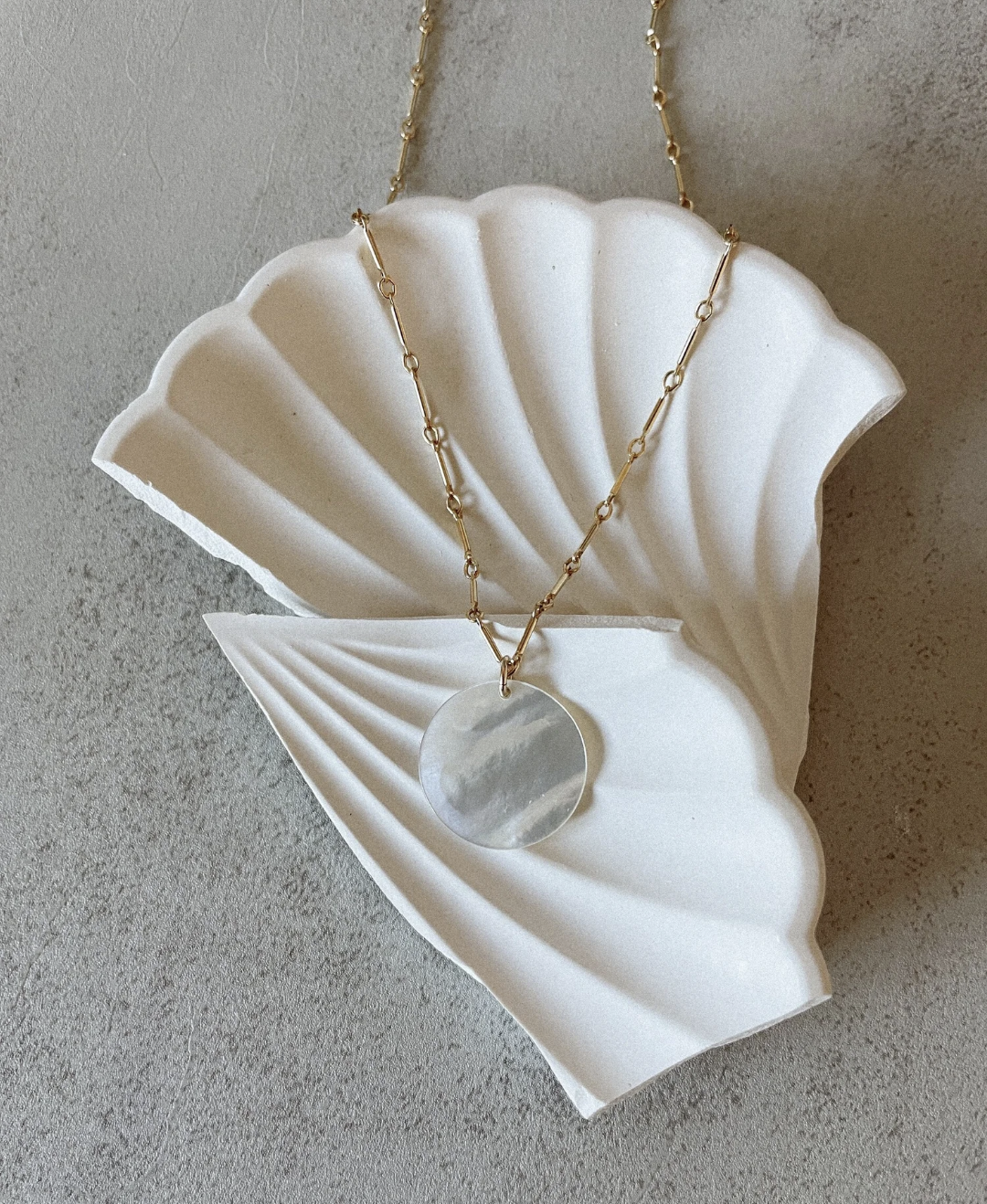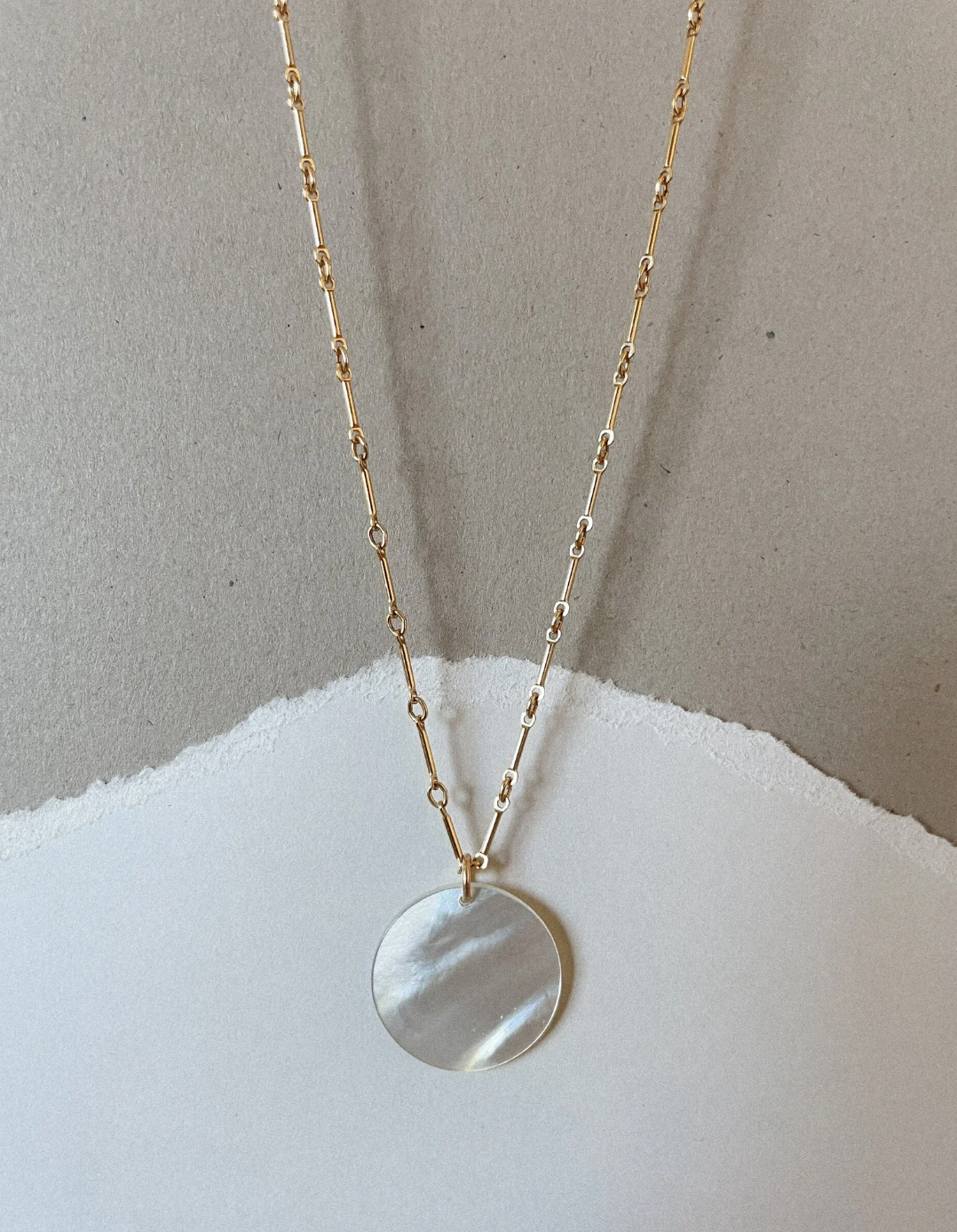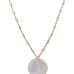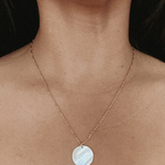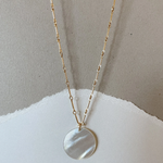The Moonlight Necklace features a lustrous pearl disc pendant delicately suspended from a fine gold chain. This elegant piece combines timeless sophistication with subtle charm, making it perfect for both everyday wear and special occasions.