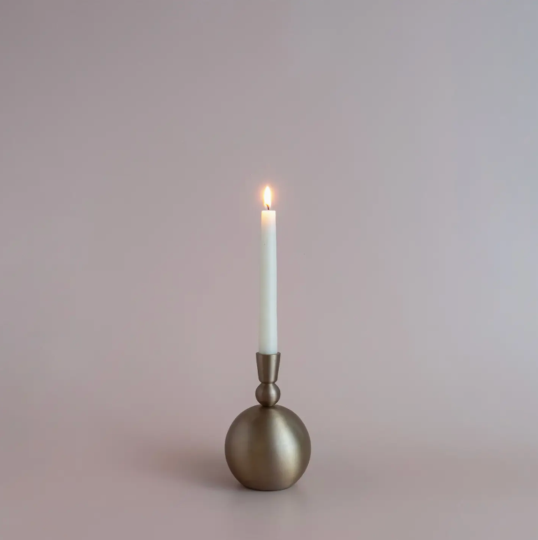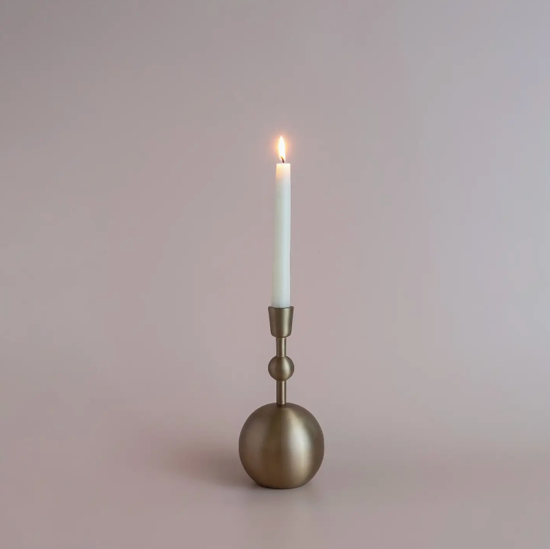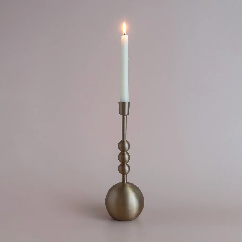 The Stacked Orb Candle Holder brings warmth and charm to any space with its antique gold finish and unique spherical design. Inspired by mid-century modern aesthetics, this candle holder adds a striking touch to mantels, tables, or shelves. Available in three sizes for versatile styling, they can be arranged as a set for a cohesive look or displayed individually to suit any decor.
