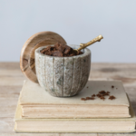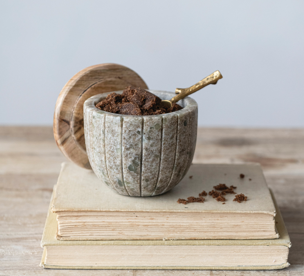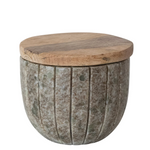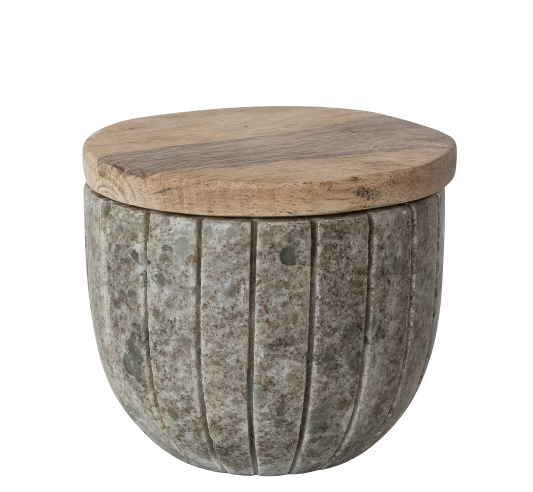 Raw stone meets warm wood. The Desert Quarry Canister pairs carved marble with a smooth mango wood lid for a balance that feels grounded and refined. Subtle veining and vertical ribbing give it quiet movement, while the natural wood top softens the weight of the stone. Style it on a kitchen counter, bath vanity, or open shelf — functional storage that looks intentionally curated.